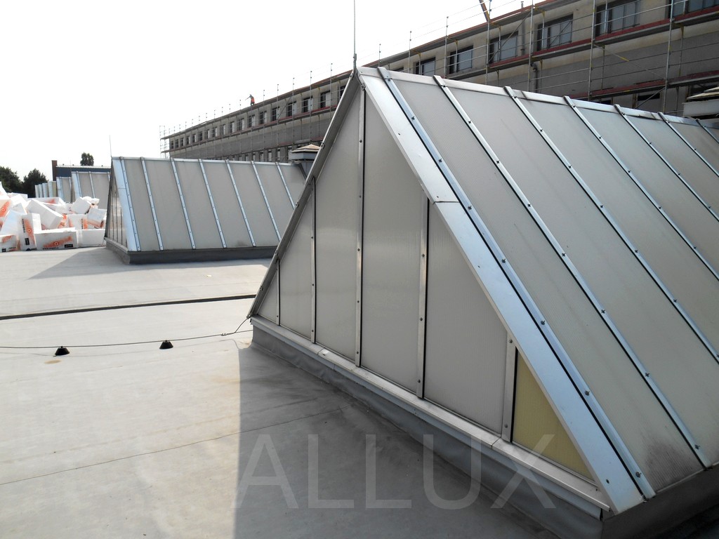 Ukázka – ALLUX SANDWICH THERMO – rekonstrukce sedlových světlíků – SOŠ Jarov, Praha 9